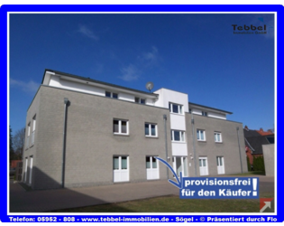 Diese geräumige und schöne Eigentumswohnung mit 3 Zimmern befindet sich in direkter Zentrumslage von Sögel. Hier wird Ihnen eine Eigentumswohnung im 1. Obergeschoss eines sehr gepflegten Mehrfamilienhauses mit nur 6 Wohneinheiten geboten. Diese Wohnung verfügt über eine optimale und durchdachte Wohnflächenaufteilung. Die Wohnfläche dieser Wohnung teilt sich wie folgt in Wohn-/Esszimmer, Küche, zwei Schlafzimmer, Badezimmer, Flur, HWR, Garderobe und Gäste-WC auf. Die hellen, lichtdurchfluteten Wohnräume geben einen besonderen Charme und darüber hinaus wurde viel Wert auf ein hohes Maß an Wohnqualität gelegt. Besonders hervorzuheben ist die clever und optimal geschnittene Grundrissaufteilung dieser Wohnung. Ein großzügiger und überdachter Balkon ist vorhanden. Hier kann man den gelungenen Tag mit der Familie und Freunden gemütlich ausklingen lassen. Im gemeinschaftlichen Treppenhaus ist ein Personenaufzug vorhanden; somit ist auch das altersgerechte Wohnen komfortabel möglich.