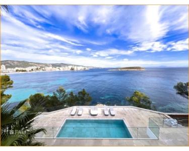 Die lichtdurchflutete Luxusvilla genießt einen fulminanten 180-Grad-Blick auf das Mittelmeer, Torrenova und den Sandstrand von Magaluf.