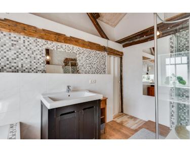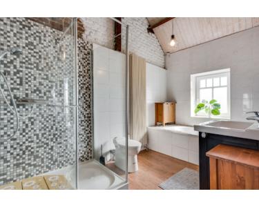 Badezimmer (3,63 x 2,28 m) mit Dusche, Badewanne, Badmöbel und Sanibroyeur-Toilette.