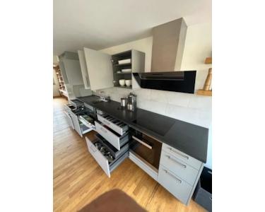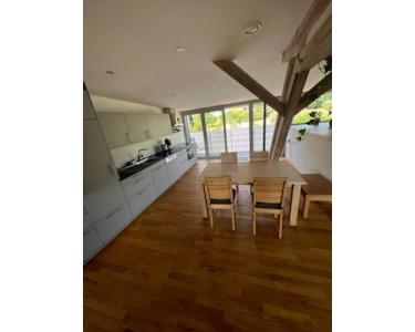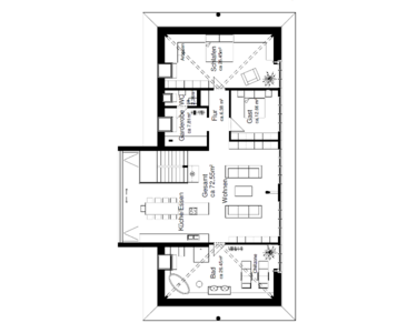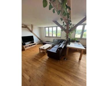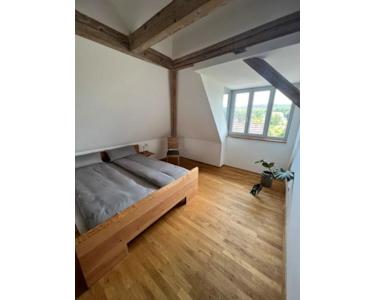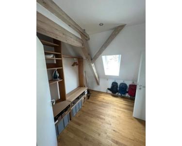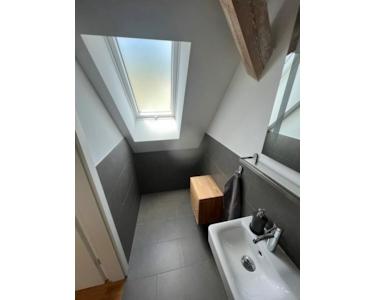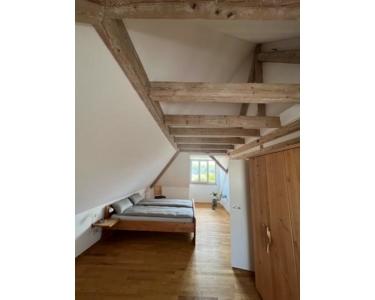 Das Dachgeschoss (DG) mit seinem offen Wohncharakter vermittelt den Flair eines Lofts. Küche, Wohn- und Essbereiche sind komplett offen gehalten und sind mit einem Parkettboden ausgelegt. Im gesamten DG ist die ursprüngliche Dachkonstruktion sichtbar und unterstützt dadurch zusätzlich den Flair eines Lofts. Der Bereich Küche/Essen ist beim Umbau durch eine großzügige Dachgaupe, die auch einen Aufenthalt im Freien erlaubt, erweitert worden. Durch diese Dachgaupe konnte auch das zweiläufige Treppenhaus bis zum DG erweitert und hierdurch sein einfacher Zugang ermöglicht werden. Im westlichen Giebelbereich befindet sich das chillige Bad welches durch seine Großzügigkeit nicht nur alleine für die Körperhygiene genutzt kann. Ein kleinerer ca. 12,66m² und ein großzügigerer Schlafraum von ca. 26,45m² mit Arbeitsplatz sowie eine Garderobe und ein von ihr aus zugängliches separates WC, welche beide über Dachflächenfenster belichtet werden, runden die Räumlichkeiten im DG ab.