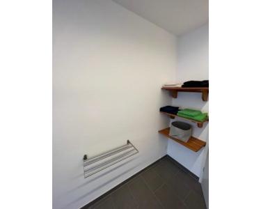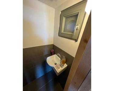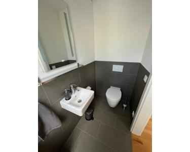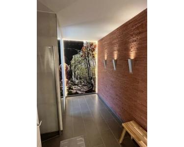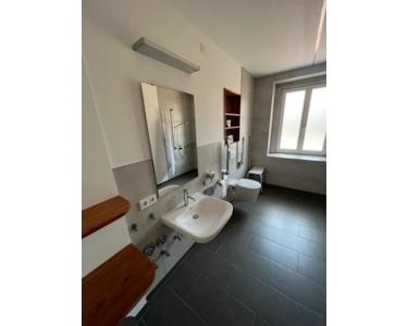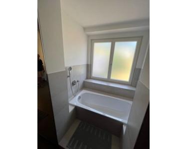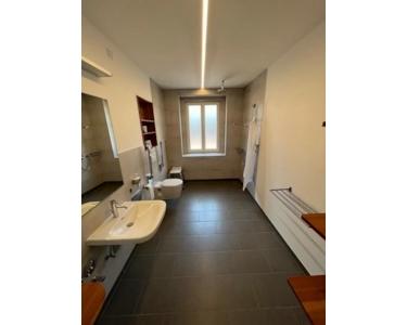 Die hellen Wandfliesen bieten einen klaren Kontrast zu den dunklen Bodenfliesen und die der Dusche und der Badewanne gegenüber liegenden Wand, welche mit rötlichen Riemchen verkleidet ist. Die zwei Waschbecken mit großen Spiegeln erlauben es sich zu zweit bei einer extravaganten Beleuchtung des gesamten Bades, der Morgen- oder Abendtoilette zu widmen, die im wahren Sinn des Wortes „Erlebnisbad“ dies zu einem Erlebnis werden lässt.