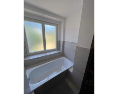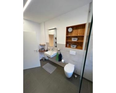 Das größere der beiden Bäder, die beide mit grauen Bodenfliesen ausgelegt sind, lässt in seiner Ausstattung keine Wünsche offen und bietet einerseits eine abgetrennte begehbare raumhoch geflieste Dusche, als auch eine für die Entspannung nutzbare Badewanne.