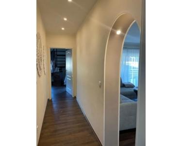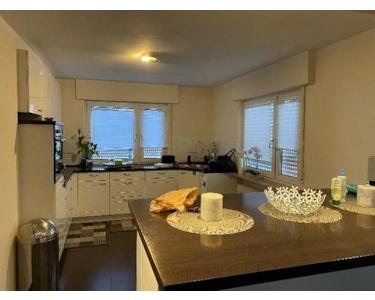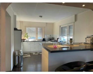 Nachdem Sie nun das Haus betreten haben, stehen Sie im Eingangsbereich der ersten und zugleich größten Wohnung. Auf ihren insgesamt 180m², die sich bis in den Kellerbereich erstrecken, befinden sich eine große, sowie praktisch und zum EZi offen gestaltete Küche.