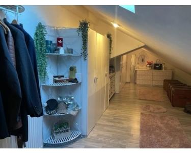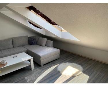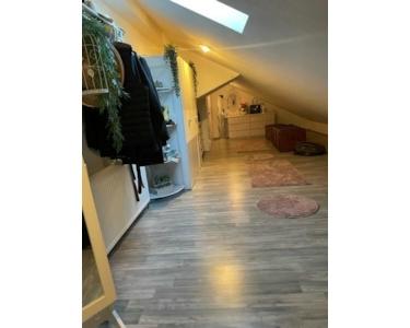 Als Letztes möchte ich Ihnen die Wohnung im Dachgeschoss, mit ihren 50m² zeigen. Diese beherbergt eine Küche mit Essbereich, ein Tageslichtbad mit Dusche und ein Wohnzimmer mit abgetrenntem Schlafbereich.