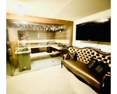 Wellnessbereich im Untergeschoss mit großer Sauna und begehbaren Duschbereich.