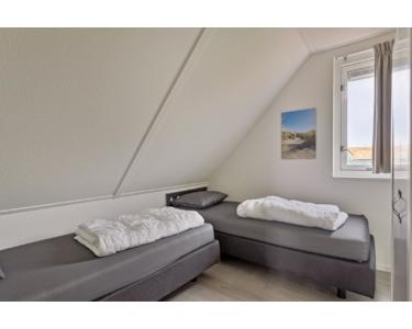 Zwei Boxspringbetten und ein schmaler Kleiderschrank befinden sich in diesem Schlafzimmer. Außerdem gibt es ein Dreh-Kipp-Fenster, durch das viel frische Luft hereinkommt.