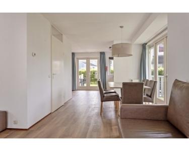 Das Wohnzimmer befindet sich an der Vorderseite des Hauses und verfügt über eine überdachte Terrasse mit Blick auf den Garten. Die gesamte Etage hat einen neuen PVC-Bodenbelag in einer attraktiven Farbe mit Holzmotiv. Es gibt auch moderne Möbel und einen schönen Flachbildfernseher. Viele Fenster sorgen für angenehmes Licht und es gibt viele Lüftungsmöglichkeiten. Angrenzend an das Wohnzimmer befindet sich der Essbereich, der mit der Küche in offener Verbindung steht.