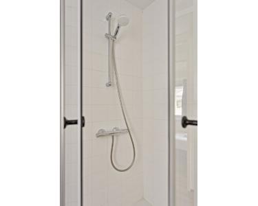 Im Obergeschoss befindet sich das Badezimmer mit Duschkabine, Waschbecken mit Spiegel und eingebauter Beleuchtung sowie eine Toilette.
