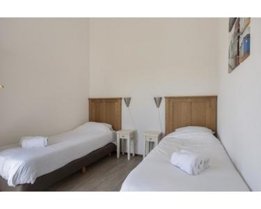 Schlafzimmer 2 hat 2 einzelne Boxspringbetten und einen Kleiderschrank.
