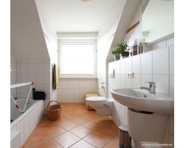 Das helle und geräumige Badezimmer ist mit einer Badewanne, einer Dusche, einem Waschbecken und einem Hänge-WC ausgestattet. Es ist weiß gefliest und modern ausgestattet. Ein Fenster sorgt für ausreichende Belüftungsmöglichkeiten und viel Licht. Ein besonderes Highlight sind hier die Fußbodenheizung, die Decken- und Wandheizung!