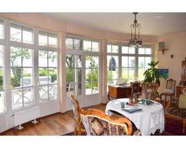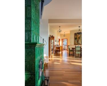 Auch die Inneneinrichtung erinnert an die alten Zeiten. In der Mitte befindet sich der Gemeinschaftsraum, das Wohnzimmer mit einem gemütlichen Kachelofen, das Esszimmer, das Arbeitszimmer und rechts und links davon die Schlafzimmer und Bäder. Hinter dem Gebäude befindet sich eine Doppelgarage.
