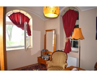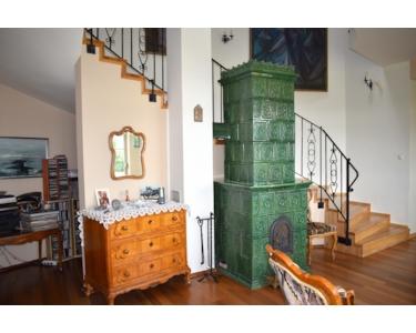 A belső kialakítás is a régi kort idézi. A középső rész a közösségi tér, nappali hangulatos cserépkályhával, étkező, dolgozó szoba, majd innét jobbra és balra vannak a hálószobák és a fürdők. Az épület mögött dupla garázs van.