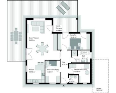 Der Winkelbungalow als Fertighaus präsentiert eine Architektur, die sowohl Modernität als auch Sicherheit verkörpert. Dank seiner besonderen Bauweise bietet dieser Entwurf eine gemütliche überdachte Terrasse, die als perfekter Rückzugsort dient und bei nahezu jedem Wetter Schutz bietet. Die Terrassentüren verleihen dem Wohnzimmer Charme und schaffen eine Verbindung zwischen Wohnbereich, Garten und Terrasse. Der Winkelbungalow erfreut sich großer Beliebtheit aufgrund seiner durchdachten Bauform. Der großzügige Wohn-/Ess- und Kochbereich bietet viel Platz für Entfaltung. Durch die Terrassentüren gelangt man direkt von der Küche und dem Essbereich auf die Terrasse und in den Garten. Ein geräumiges Schlafzimmer mit Zugang zur Terrasse, ein komfortables Bad, optional mit Wanne und Dusche, sowie ein zusätzlicher Raum, der als Büro, Kinder-/Gäste- oder Hobbyraum genutzt werden kann, komplettieren das Angebot. Die durchdachte Raumplanung des Winkelbungalows als Fertighaus gewährleistet einen hohen Wohnkomfort und kurze Wege.
