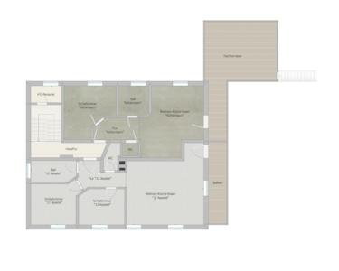 große Terrasse ( ca. 120 m²) mit Blick ins Grüne, Küche mit kleinem Lager, Büro, Treppenhaus,