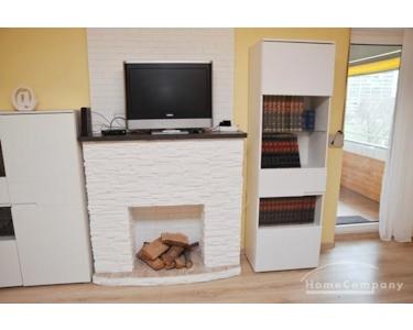 Wohnzimmer mit 2 Schlafsofas 140x200 cm, Couchtisch, Wohnwand mit Smart-TV, Internet (200MBit) inklusive, Deko-Kamin, Kommode, Zugang zum