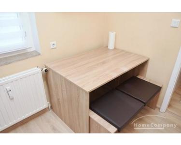 Einbauküche, komplett ausgestattet mit Herd, Ofen, Mikrowelle, Kühl-/Gefrierschrank, Tisch mit Sitzbank und 2 Stühlen.