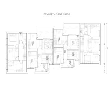Das Haus erstreckt sich über das Erdgeschoss und den ersten Stock und besteht aus einem überdachten Eingang, einem Abstellraum, einer Küche mit Esszimmer und Wohnzimmer, einem Badezimmer, einer überdachten Terrasse und einem Garten. Im ersten Stock gibt es einen Flur, drei Schlafzimmer, eine Loggia und ein Badezimmer.