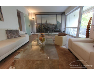 Das großzügige Wohnzimmer ist modern eingerichtet. Die Wohnung verfügt über eine separate Küche. Der Balkon bietet einen freien Blick ins Grüne.