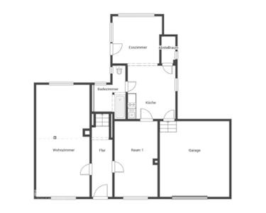 Beim Betreten des Hauses wird man von einem geräumigen Eingangsflur empfangen, der Zugang zu verschiedenen Bereichen bietet. Nach links gelangt man in den Wohnbereich, während sich rechts ein Zugangsraum befindet, der zur Küche führt. In der Küche ist das Badezimmer links und der Zugang zur Garage rechts positioniert. Ein gerader Durchgang vom Eingangsflur führt zum Esszimmer, das wiederum einen direkten Zugang zur Terrasse und zum Garten bietet.