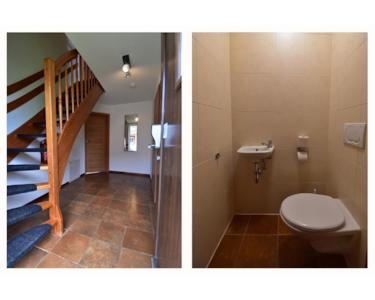 Dieses Badezimmer besteht aus einer Badewanne, einem Waschbecken mit großem Spiegel. Die Badewanne ist mit einer thermostatischen Armatur ausgestattet. Dieses Bad befindet sich im Erdgeschoss neben dem Schlafzimmer.