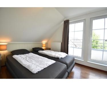 In der ersten Etage befinden sich 2 weitere geräumige Schlafzimmer mit Drehkippfenstern. Durch dieses Schlafzimmer hat man Zugang zum Balkon. Hier gibt es 2 Boxspringbetten und einen Kleiderschrank. Dieses Schlafzimmer ist sehr geräumig.