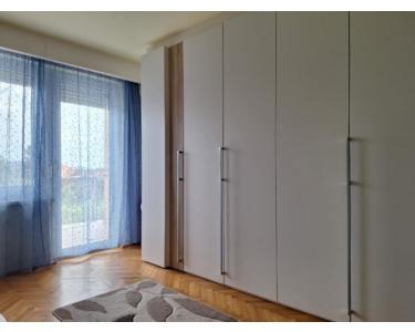 Erster Stock (36 m2): Flur, zwei Zimmer, Badezimmer und ein 10 m2 großer Balkon.