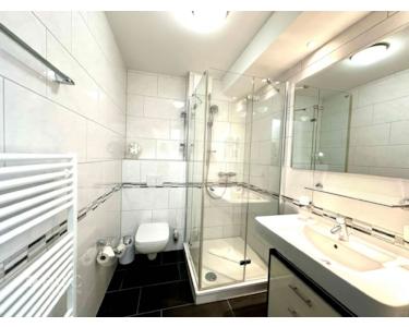 * ein helles Bad mit Dusche und modernen Badmöbeln (Handtuchheizkörper, Fön)
