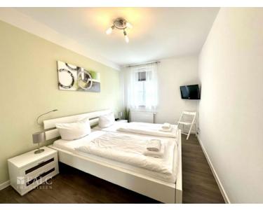 * ein Schlafzimmer mit großem Doppelbett (1,80 m x 2,00 m), Schrank, Fernseher