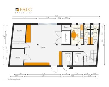 Im Nebenraum befindet sich die Warenvorbereitung sowie ein kleines Büro. Im Untergeschoss (99m2) gibt es ein großes Lager, eine Küche für die Angestellten und einen Toilettenbereich. Ein Lastenaufzug befördert die Ware nach oben.