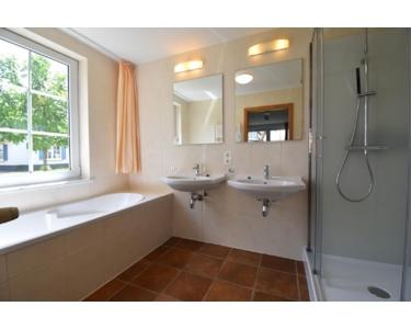 Badezimmer 3 verfügt über eine geräumige Badewanne mit einer neuen Badewannenabtrennung und einem modernen Waschbecken, ideal zum Entspannen und Pflegen.