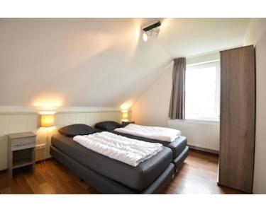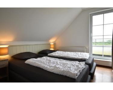 Das Schlafzimmer im Obergeschoss hat zwei bequeme Boxspringbetten und einen geräumigen Kleiderschrank.