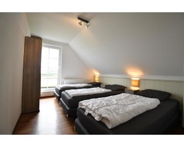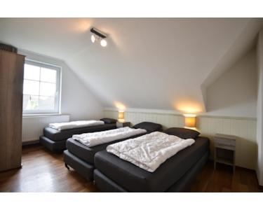 Das Schlafzimmer ist mit drei bequemen Boxspringbetten ausgestattet, ideal für eine erholsame Nachtruhe.