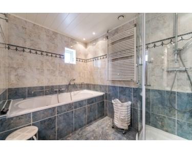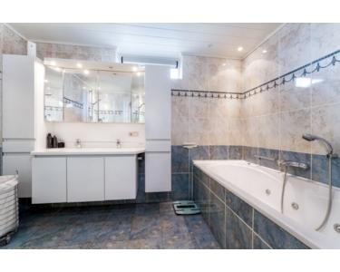 Das gepflegte Badezimmer ist mit einer Dusche, einem Doppelwaschbecken und einer Badewanne ausgestattet. Außerdem finden wir eine separate Toilette.
