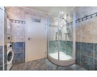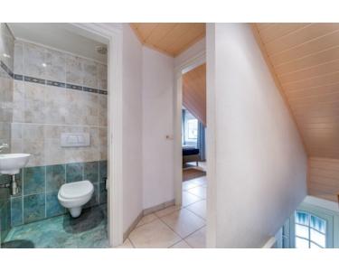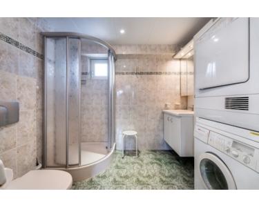 Das gepflegte Badezimmer kann mit Recht als geräumig bezeichnet werden. Es ist mit einem Doppelwaschbecken, einer Dusche und einer Badewanne ausgestattet. Hier finden wir auch den Anschluss für die weiße Ware. Eine separate Toilette vervollständigt das Ganze.