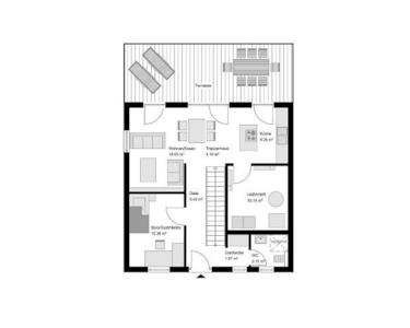 Im Erdgeschoss befinden sich ein offen gestalteter Wohn-/Ess- und Kochbereich mit einem praktischen Haustechnik-/Hauswirtschaftsraum, direkt neben der Küche. Ein Zusatzraum, der als Homeoffice, Gäste-, Schlaf- oder Hobbyraum genutzt werden kann, bietet zusätzlichen Komfort. Die Diele mit dem Treppenhaus ist mittig angeordnet. Neben dem Eingangsbereich ist eine Garderobennische und ein Gäste-/WC eingeplant. Das Gäste- WC kann optional auch als Duschbad ausgebaut werden. Im Obergeschoss des Hausentwurfes befinden sich zwei nahezu gleich große Kinderzimmer, ein geräumiges Familienbad und der Elternschlafbereich mit Ankleide und direktem Zugang zum Bad. Die Nettoraumfläche beträgt 125 m².