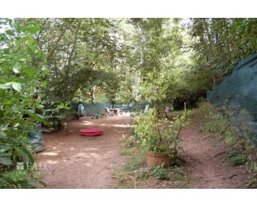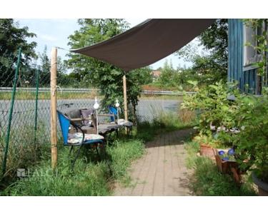Vor dem Gebäude stehen drei Stellplätze zur Verfügung. Der Garten ist eingezäunt und über eine Holztreppe rechts vom Gartentor zugänglich. Der Zugang zum Keller erfolgt über eine grüne Holztür, die man von den Parkplätzen aus gut erreichen kann.