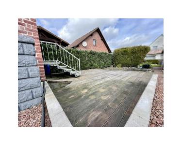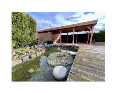 - dessen Belag mit widerstandsfähigem Garapa-Holz (geriffelt) ausgestattet ist - sowie zum schön angelegten Garten mit Teichanlage und Gartenhaus.