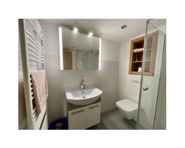 Aktuelle Oberböden: In den Wohn- und Schlafräumen ist Laminat verlegt. Im Haupt-Bad (Erdgeschoss) sowie im Tageslicht-WC (Dachgeschoss) sind geschmackvolle Fliesen verlegt.