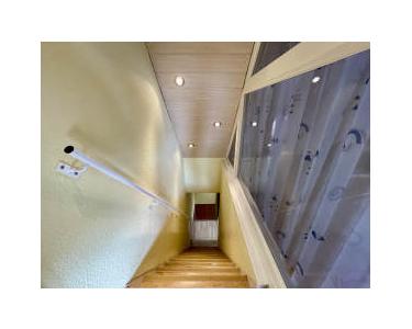 Das Dachgeschoss ist im Bereich des Treppenlaufs durch eine Glasfront nebst Sicherheits-Glastür abgetrennt, sodass einerseits kein Durchzug entstehen kann und andererseits eine räumliche Abgeschlossenheit der privaten und wohnlichen Verhältnisse zwischen den jeweiligen Wohnetagen gegeben ist.
