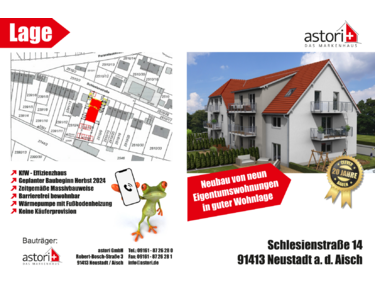 Die Wohnung wird zentral in Neustadt an der Aisch liegen und bietet eine hervorragende Anbindung an alle wichtigen Einrichtungen des täglichen Lebens. Einkaufsmöglichkeiten, Krankenhaus, Schulen und Kindergärten sind in unmittelbarer Nähe.