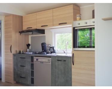 Die Küche ist geräumig und mit verschiedenen Geräten wie Kühlschrank, Gefrierschrank, Geschirrspüler, Mikrowelle, Backofen, Herd und Abzugshaube ausgestattet. Die Küche befindet sich auf der Rückseite des Chalets.