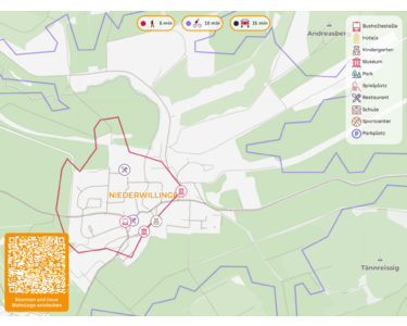 Die Lage besticht durch eine sehr gute Anbindung an das öffentliche Verkehrsnetz. Die nächstgelegene Bushaltestelle "Niederwillingen" ist nur 209 Meter entfernt, was eine komfortable Erreichbarkeit der umliegenden Städte und Gemeinden ermöglicht. Darüber hinaus sind die Autobahnen A71 und A73 in kurzer Fahrtzeit erreichbar, was eine optimale Anbindung für den Individualverkehr gewährleistet. Der nächstgelegene internationale Flughafen Erfurt-Weimar ist in etwa einer Stunde mit dem Auto erreichbar, was für Vielreisende und Geschäftsleute von Vorteil ist.