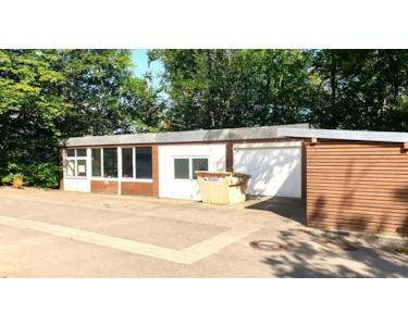 Die zur Vermietung stehende Gewerbeimmobilie mit Schweißhalle steht auf dem Gelände des Klinikums Langensteinbach.