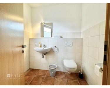 Dieser Raum, ausgestattet mit einem modernen Badezimmer, eignet sich besonders gut für Kosmetikerinnen, Heilpraktikerinnen oder ähnliche Berufsgruppen, die zusätzliche Privatsphäre und Komfort benötigen.