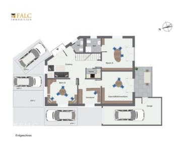 1. Sekretariat und Geschäftsführerbüro mit kleiner Terrasse inklusive Garage (ca. 34m2) und eigenem Stellplatz: