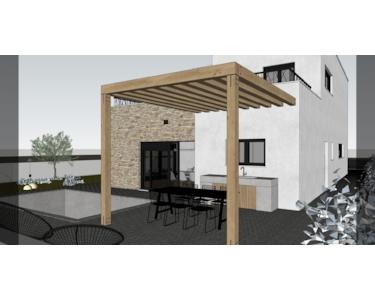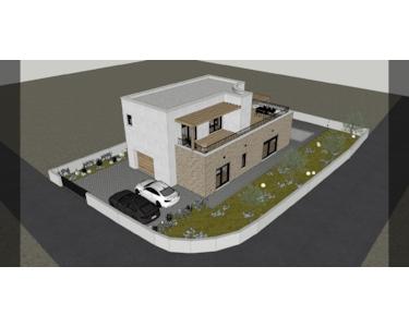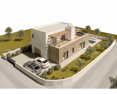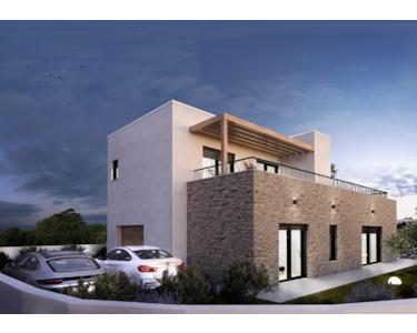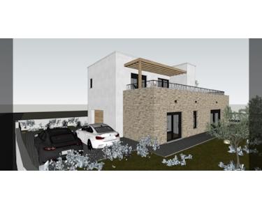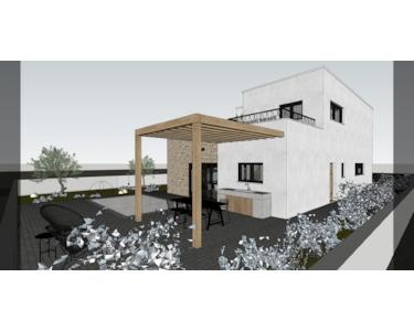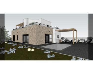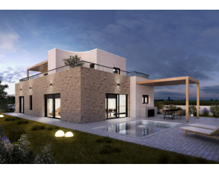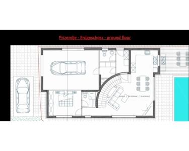 Es besteht aus Erdgeschoss und ersten Stock. Im Erdgeschoss gibt es eine Garage, Flur, Toilette, Schlafzimmer, Badezimmer, Küche-Esszimmer-Wohnzimmer mit Ausgang zur Terrassen mit Pool.
