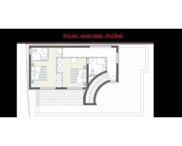 Im ersten Stock befinden sich zwei Schlafzimmer, zwei Badezimmer, ein Flur, großzügige Terrassen mit schöner Aussicht.