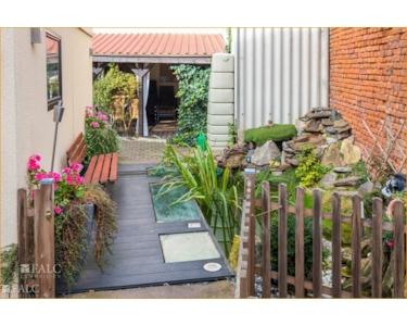 Im Innenhof wurde eine große Doppelgarage errichtet und auch die Aussenanlage wurde liebevoll mit einer Terrasse und einem Teich gestaltet.