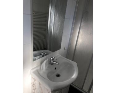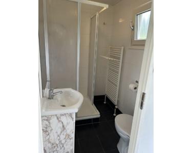 Funktionelles Badezimmer mit Duschkabine, Ventilator, Designheizkörper mit Handtuchhalter, Toilette, Wandregalen und Waschbecken mit beleuchtetem Spiegel und Möbeln. Das Badezimmerfenster ist zusätzlich mit Insektenschutz ausgestattet.