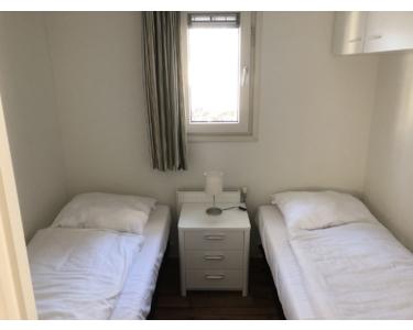 Schlafzimmer mit 2 Einzelbetten (Boxspring) und schwebenden Wandschränken. Das Schlafzimmerfenster ist mit Insektenschutz ausgestattet.